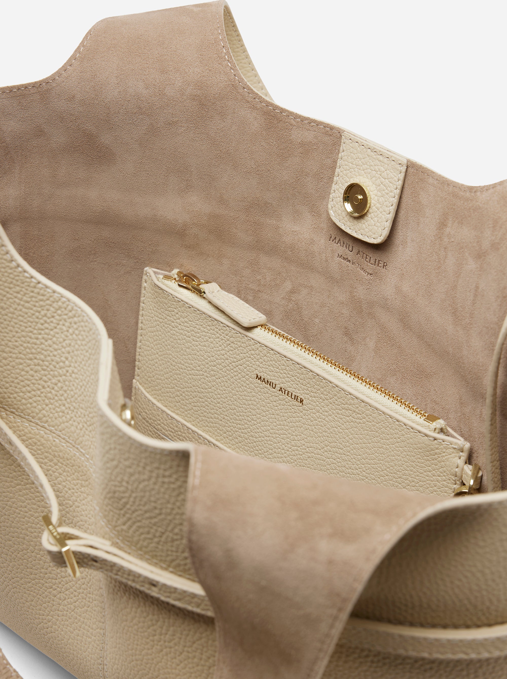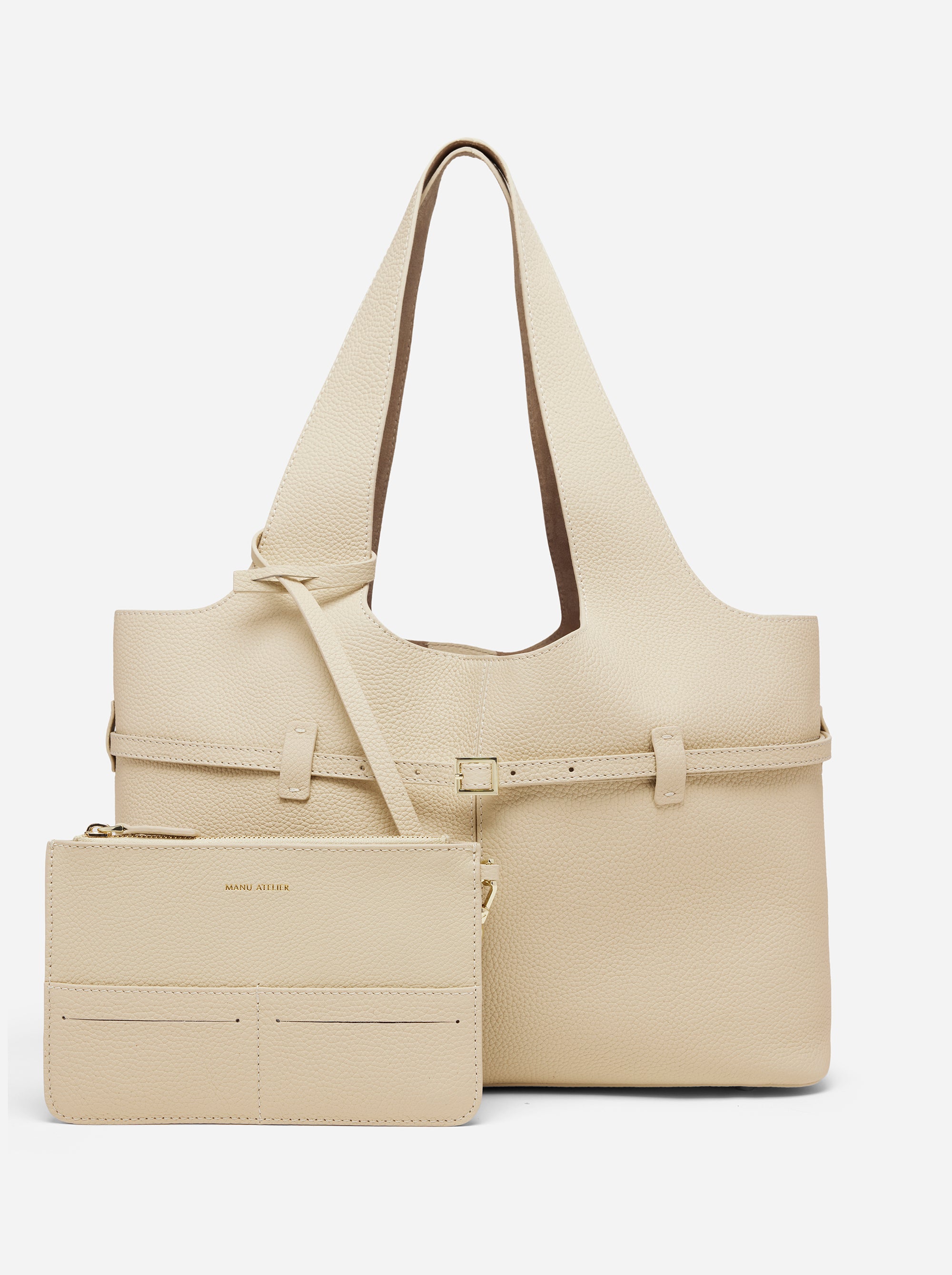 The Manu Atelier Cambon Cabas in Vanilla is a study in effortless sophistication. Cut from certified premium leather, its softened, sculptural shape and precise workmanship embody iconic craftsmanship. A suede-lined interior and removable pouch make everyday use seamless—compact yet functional, spacious and practical for modern routines. Dual top handles offer refined comfort, while the silhouette remains elegant for every occasion.