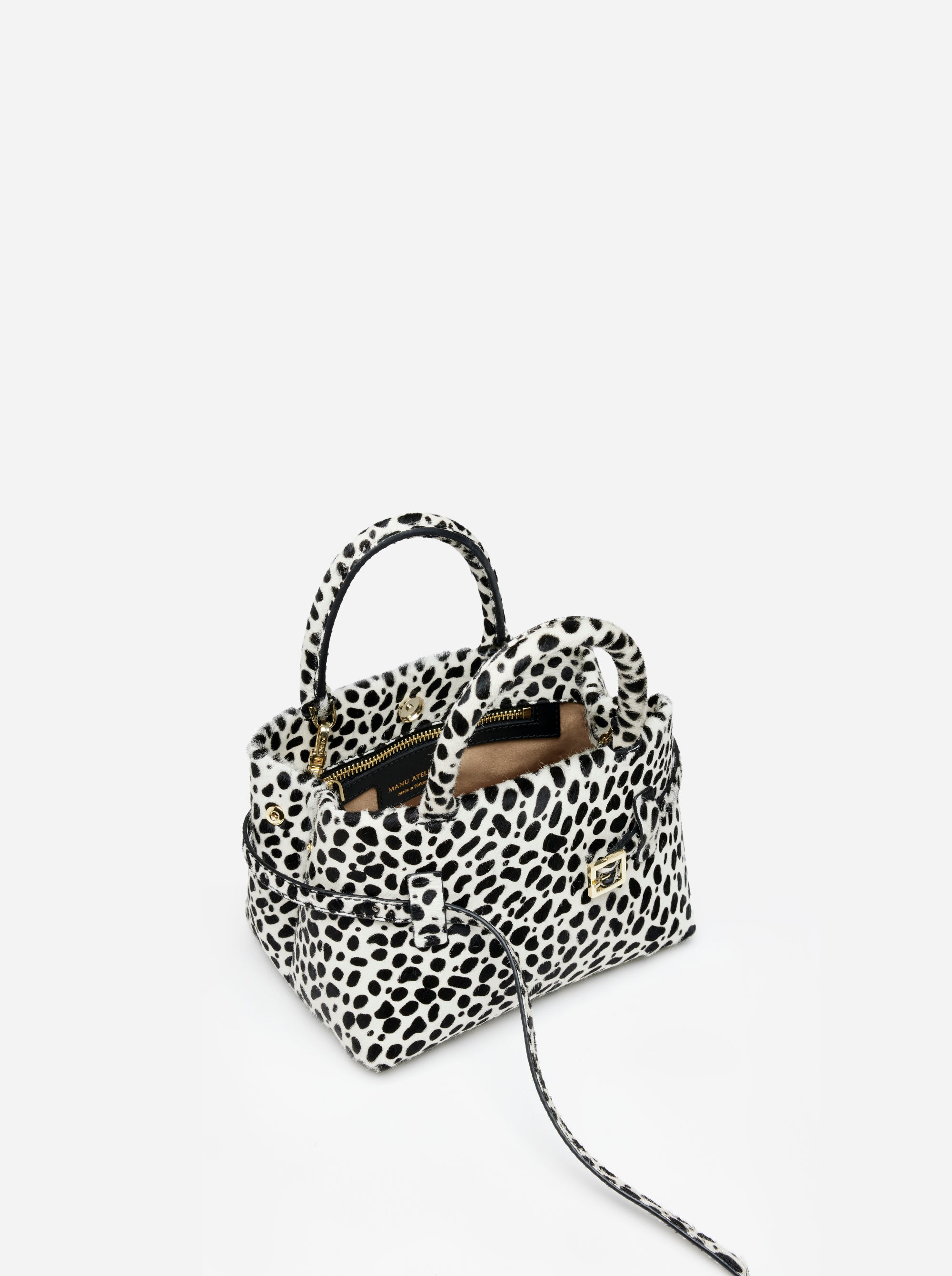 Le Cambon 20 Dalmatian blends bold color with iconic Manu Atelier structure. Premium leather, sleek handle and strap, and a zipped pocket ensure compact organization and sophistication. A concentration of elegance and contemporary spirit makes this mini bag an elevated essential for modern wardrobes.