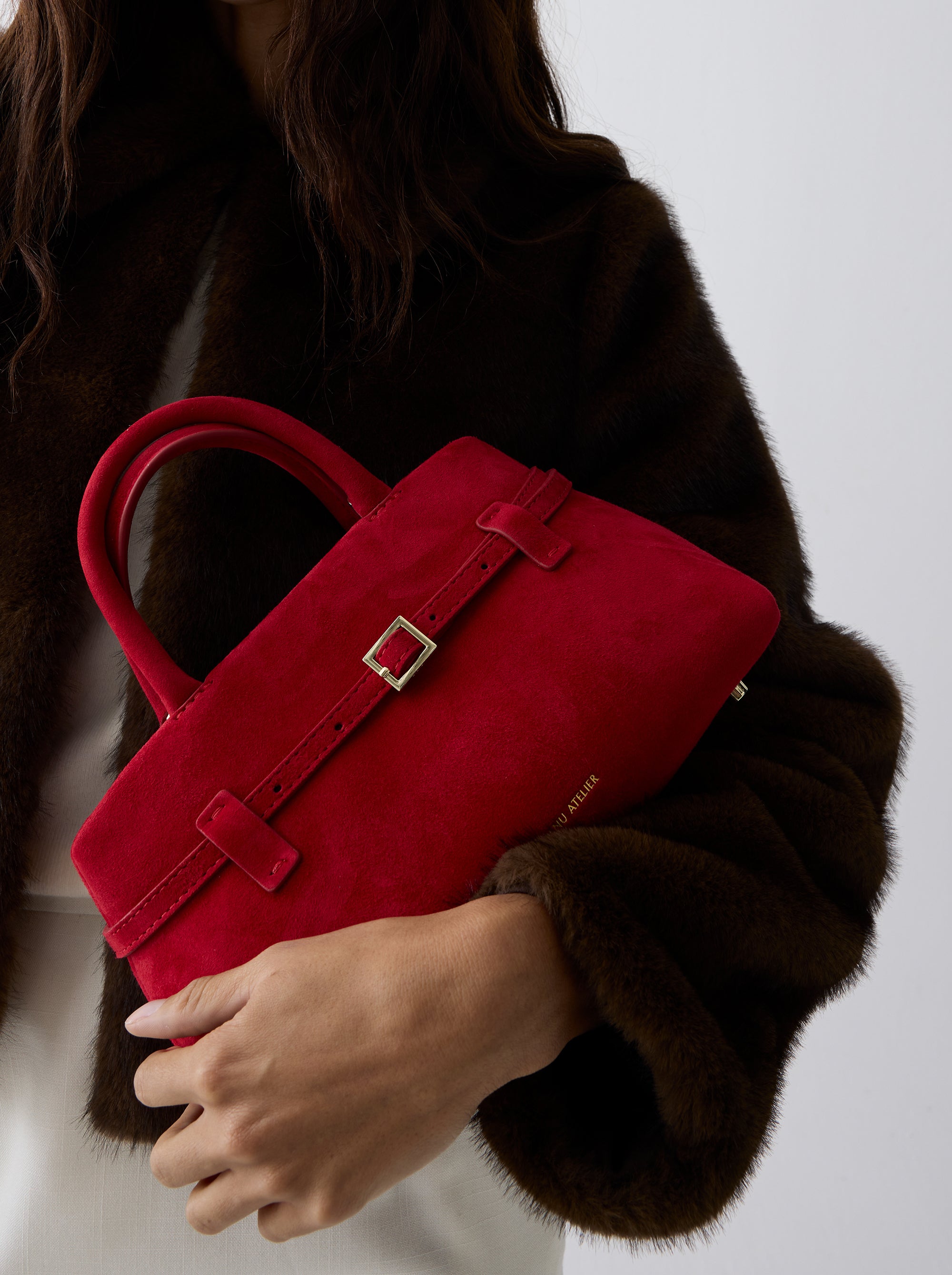 Stand out in style with the Manu Atelier Le Cambon 25 Red Suede. This striking piece showcases vivid red suede, a structured minimalist silhouette, and intuitive top handles. The adjustable strap, beige lining, and practical zipped pocket make it functional for everyday luxury, blending iconic craftsmanship with bold elegance.