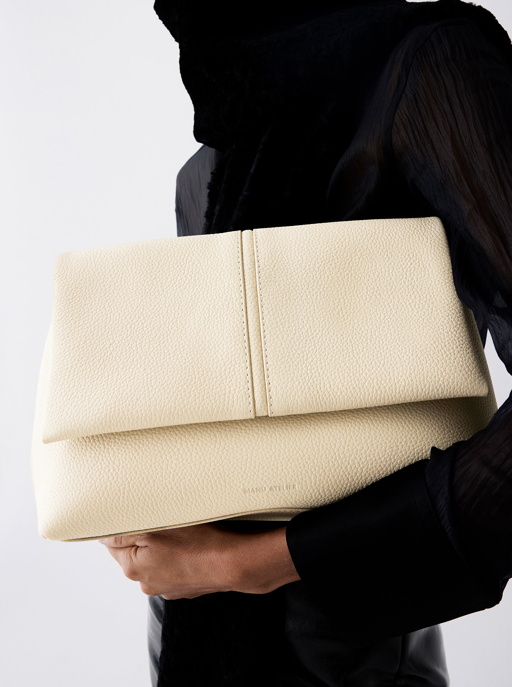 The Fold Bag introduces a new silhouette within Manu Atelier’s universe. Defined by its structure and deliberate sense of ease, its architectural flap settles over a gently contoured body, balancing clarity of form with a subtle softness. The strap can be removed, allowing the bag to shift from a shoulder style to a clean, understated clutch without interrupting its silhouette. Crafted with close attention to surface and construction, The Fold Bag lets each material—textured, smooth, or pattern-driven—shape the mood of the piece, keeping the design grounded in form and intention.